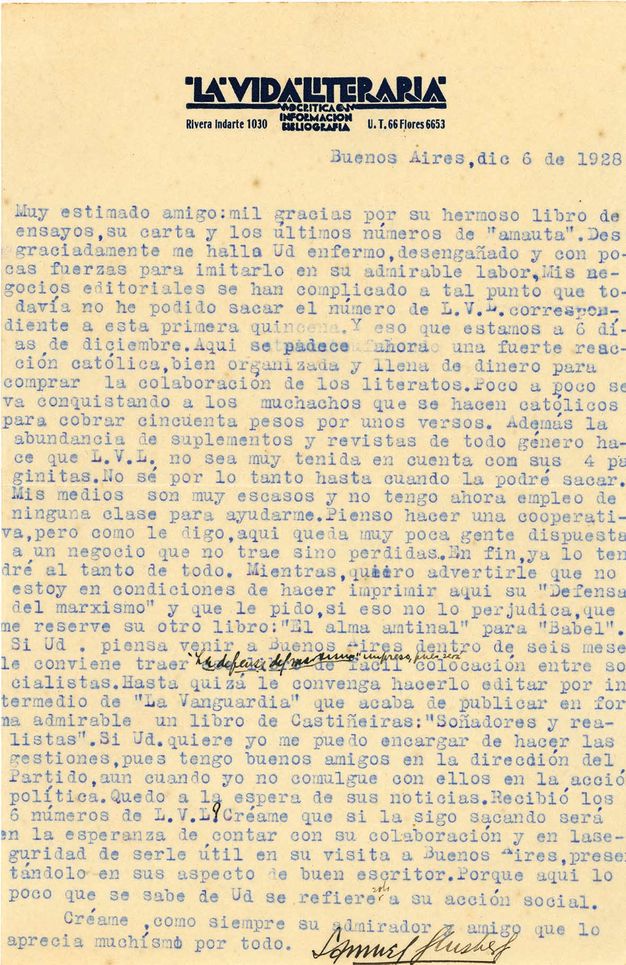 Carta de Samuel Glusberg a José Carlos Mariátegui, 06/12/1928. ↩︎