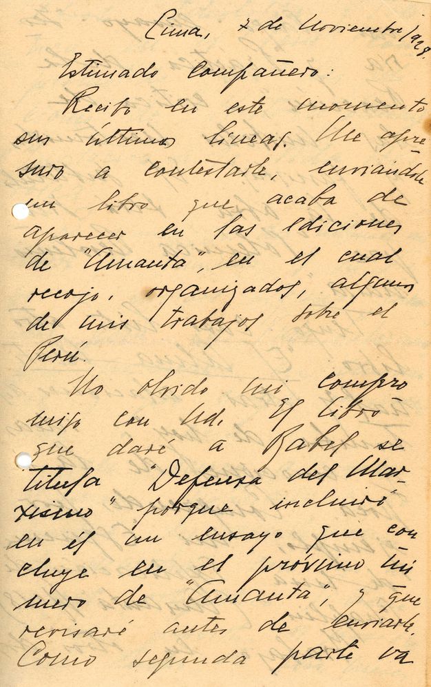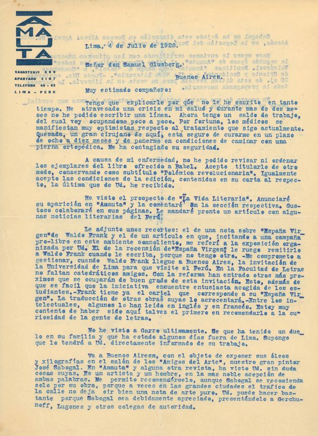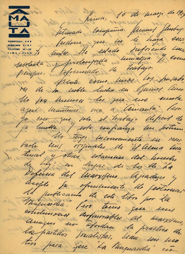 “Que no le extrañe la tardanza con que contesto su carta del 10 de agosto. He pasado semanas enteramente atareadas por corrección de pruebas de mi libro en prensa en Lima6, revisión de originales del libro que tengo comprometido con la editorial de Buenos Aires, el número de Amauta del segundo aniversario, que Ud. recibirá probablemente con esta carta, y otras cosas más, aparte de mi trabajo ordinario. Todo esto, pesando sobre fuerzas muy relativas y en convalecencia. No he podido escribir a ningún amigo y sólo hoy empiezo a dedicar algún tiempo a mi correspondencia”.7 G