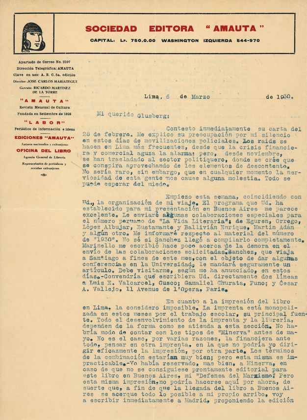 Mariátegui trabaja, pues, febrilmente. En los años finales de su vida, los “años cumbres” en la certera frase de Jorge Del Prado,8 Mariátegui edita libros para la Editorial Minerva, publica la revista Amauta, enfrenta estoicamente su salud y sufre la persecución y hostigamiento por parte de la policía política del régimen de Leguía. A ello se sumarán la organización del Partido Socialista Peruano, la publicación del quincenario Labor y el impulso inicial que llevaría a la fundación de la Confederación General de Trabajadores del Perú (CGTP). Todo esto no le permite a cabalidad escribir cartas. Glusberg le pregunta preocupado: “Hace mucho que no tengo noticias de su vida. ¿Qué hay de cierto de su viaje a Bs. As.? Mándeme algunas paginitas para L.V.L. Pienso dedicarle más adelante un número al Perú. Indíqueme algunos nombres. Después del No. 15 no volví a recibir Amauta. ¿Qué le pasa? ¿Dejó de salir otra vez? Escríbame. ¿Y su libro?”.9