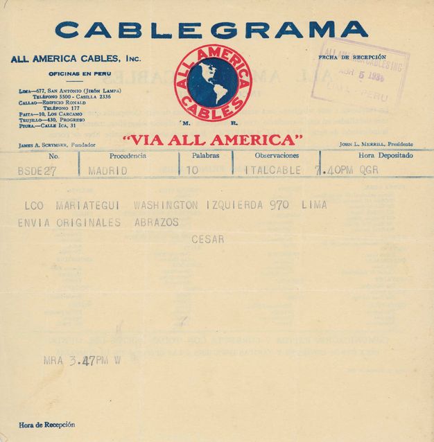 Cablegrama de César Falcón a José Carlos Mariátegui, 5/4/1930. ↩︎