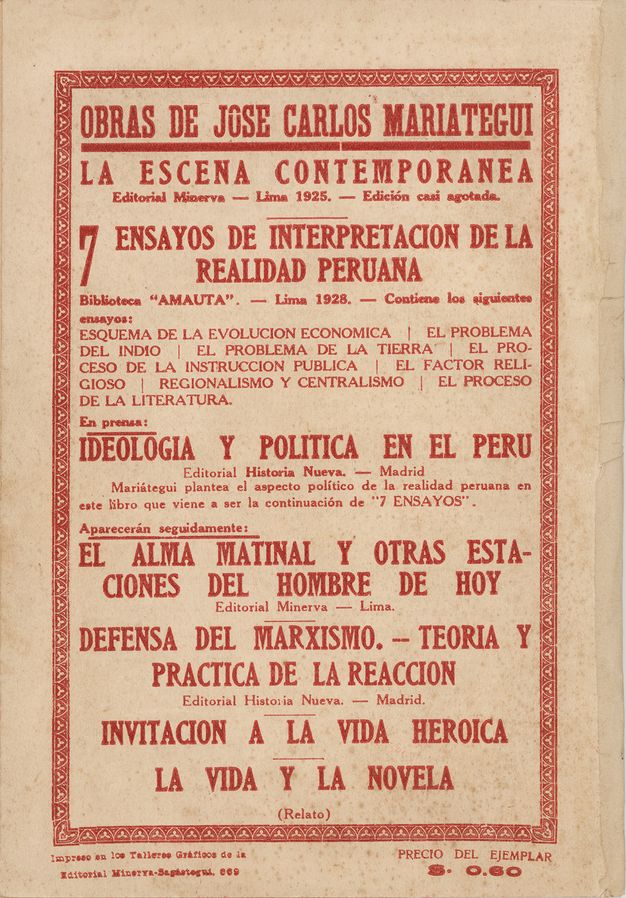 “En cuanto a la impresión del libro en Lima, la considero imposible. (…) Yo había reservado, más bien, a Minerva, en caso de que no se consiguiese prontamente editorial para este libro en Buenos Aires, mi Defensa del Marxismo. Pero esta misma impresión, no podría hacerse aquí por ahora, de suerte que, a fin de que la llegada del libro a Buenos Aires se acerque todo lo posible a mi propio arribo, voy a escribir inmediatamente a Madrid, proponiendo la edición de Defensa del Marxismo, a Historia Nueva. Podría hacer la gestión con Cenit, pero prefiero para mi primer libro en España la mediación de Historia Nueva por mi vieja camaradería con César Falcón, su director. Ese libro, por tocar debates muy actuales, y libros y tesis como los de De Man, Eastman, Emmanuel Berl, Benda, etc. con cierta originalidad doctrinal, me parece destinado a lograr alguna resonancia. Defensa del Marxismo se titula el ensayo que da su nombre al libro, cuya segunda parte está formada por otro ensayo: Teoría y práctica de la Reacción, que pongo actualmente al día, por haber sido escrito hace ya más de dos años”.23 M