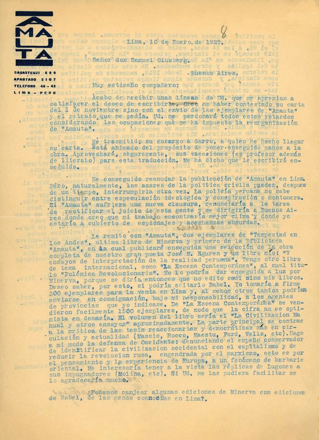 “Le remito con Amauta, dos ejemplares de Tempestad en los Andes, último libro de Minerva y primero de la Biblioteca Amauta, en la cual publicaré enseguida una selección de la obra completa de nuestro gran poeta José M. Eguren y un libro mío: 7 ensayos de interpretación de la realidad peruana. Tengo otro libro de tema internacional, como La Escena Contemporánea, al cual título Polémica Revolucionaria. No lo podría dar enseguida a luz por Minerva, porque se diría entonces que no edito casi sino mis libros. Deseo saber, por esto, si podría editarlo Babel. (…) El volumen del libro sería el de La Civilización Manual y otros ensayos aproximadamente. La parte principal se contrae a la crítica de las tesis reaccionarias y democráticas más en circulación y actualidad (Massis, Rocco, Maeztu, Ford, Wells, etc). Hago a mi modo la defensa de Occidente: denunciando el empeño conservador de identificar la civilización occidental con el capitalismo y de reducir la revolución rusa, engendrada por el marxismo, esto es por el pensamiento y la experiencia de Europa, a un fenómeno de barbarie oriental. Me interesaría tener a la vista las réplicas de Lugones a sus impugnadores (Molina, etc). Si Ud. me las pudiera facilitar se lo agradecería mucho”.2 F