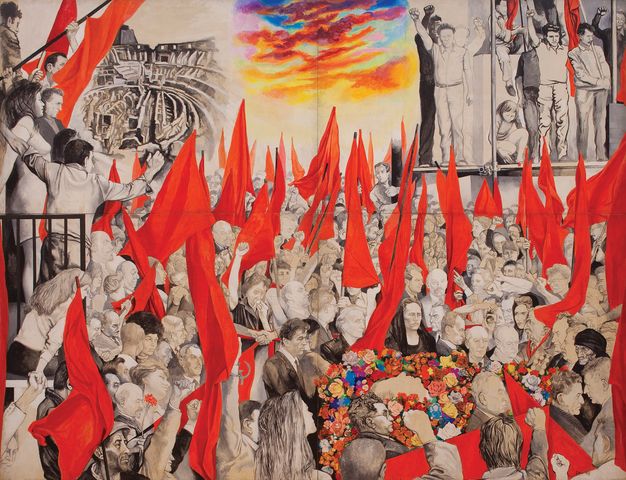 Como un aporte a la inserción de Mariátegui en cuanto icono revolucionario en el arte y la cultura popular, en Cortejo fúnebre / Funerales de un nuevo hombre su figura se ha convertido en una bandera roja rodeada por un movimiento transformador. Como en el cuadro de Guttuso, aquí la bandera roja signa la esperanza. Esa bandera que aún estaba íntegra en 1955, que en obras recientes aparece en pleno movimiento R, es un hilo rojo urdido en la trama del presente, un mito de nuestra época que invita a mirar de otro modo la tradición socialista en el Perú. Ese desplazamiento desde el retrato hacia el espacio social bien puede extenderse a otros pasajes de nuestra historia.