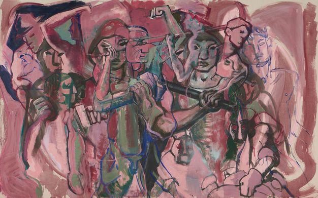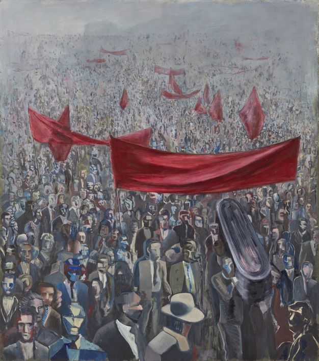Al observar de cerca el cuadro, se nota que la relativa indiferenciación de los individuos dentro de la masa en la fotografía original es aquí contestada, pues cada figura se construye bajo una doble particularidad: primero, cada persona está ubicada en la posición que la fotografía muestra, en correspondencia con la escena original; segundo —y aquí lo clave—, cada cual responde a una construcción singular del rostro y, a veces, del cuerpo. Resultaría extraño caracterizar la estrategia figurativa de cada persona como si de establecer la tipicidad o el simbolismo de un personaje se tratase, pero el conjunto establece su propio continuum al interior del cuadro. Las figuras van desde su construcción mediante la línea —que jala algunas hacia la abstracción constructivista—, y su disolución en mancha —que jala otras hacia un registro expresionista—.