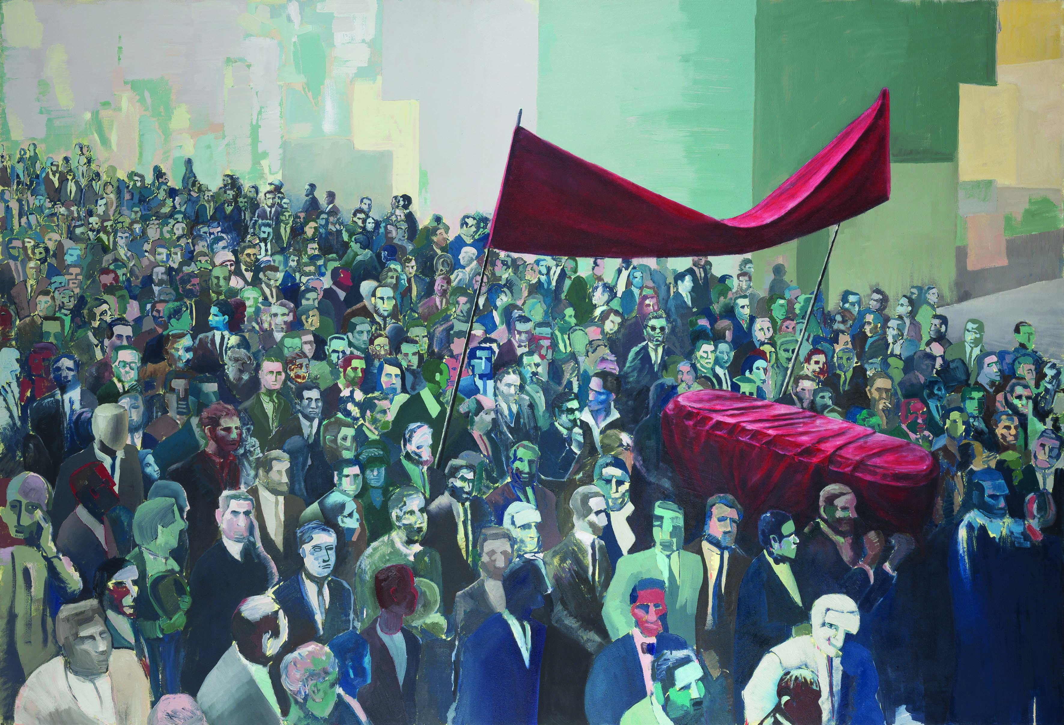 En la exhibición Un nuevo hombre (2019), Iosu Aramburu presentó por primera vez un cuadro entonces llamado Cortejo fúnebre A.1 La pintura presenta una masa humana que marcha hacia la morada final de los restos de alguien que, por la tela que recubre el ataúd y la bandera que escolta a sus cargadores, parece ser un comunista. Un líder, alguien con la capacidad de que una masa que excede el encuadre de la escena irrumpa en el espacio. Al atender a las figuras individuales, se advierte un delicado trabajo de construcción que especifica a cada cual, una a una, que funciona bien toda vez que la vestimenta otorga cierta homogeneidad al conjunto. Ese equilibrio entre las particularidades de cada figura que no disuelve la imagen global de la masa es, acaso, el principal logro formal del cuadro. Ello tiene especial relevancia cuando se comprende que se trata de una interpretación pictórica de una fotografía anónima —perteneciente al Estudio Fotográfico Hermanos Avilés— que captura la magnitud del acompañamiento del cuerpo de José Carlos Mariátegui hacia el cementerio Presbítero Matías Maestro el jueves 17 de abril de 1930, al día siguiente de su fallecimiento B. Además de la apreciable concurrencia, destaca el féretro cubierto por una bandera roja y la banderola de la Federación de Chauffeurs, quedando fuera de escena aquella de la Confederación General de Trabajadores del Perú (CGTP), que presidía la marcha C. La toma muestra el paso del cortejo por la Plaza de Armas, en la esquina con calle Pescadería (hoy, Jr. Junín).