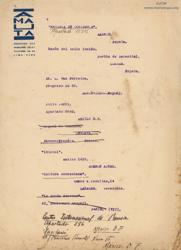 Hay que añadir que los directorios personales de Mariátegui, —en muchos casos escritos de puño y letra—, contienen datos de unos doscientos contactos entre personas e instituciones con las que había establecido vínculo y de las que recibía algunas de sus publicaciones3. En dichas listas, figuran los nombres de personajes como Miguel de Unamuno, Jorge Luis Borges, F. T. Marinetti, Henri Barbusse, Luis Araquistáin, Azorín, Ramón del Valle Inclán, Gabriela Mistral, Pablo Picasso, Alfonso Reyes, José Vasconcelos, Bernard Shaw, entre otros. Y figuran también direcciones de revistas, librerías y asociaciones en el exterior4.